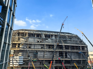 那时候,隔壁的西岸国际会展中心还是一副半成品的模样。巨大的吊车在灰蓝色的天空中挥舞臂膀,工人们腰系安全绳,像蜘蛛人一样贴在钢骨架上,小心翼翼地安装着外墙玻璃。我时常独自踱步到露台,趴在栏杆上俯瞰这片正在野蛮生长的土地。江风穿过建筑缝隙,带着一种金属与尘土混合的味道。