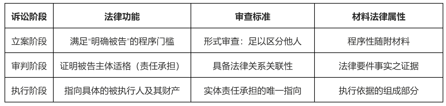 再比如,继承纠纷是将被告身份证明材料作为证据提交的最典型场景。在这类案件中,证明被告主体适格与证明案件事实几乎是重合的。